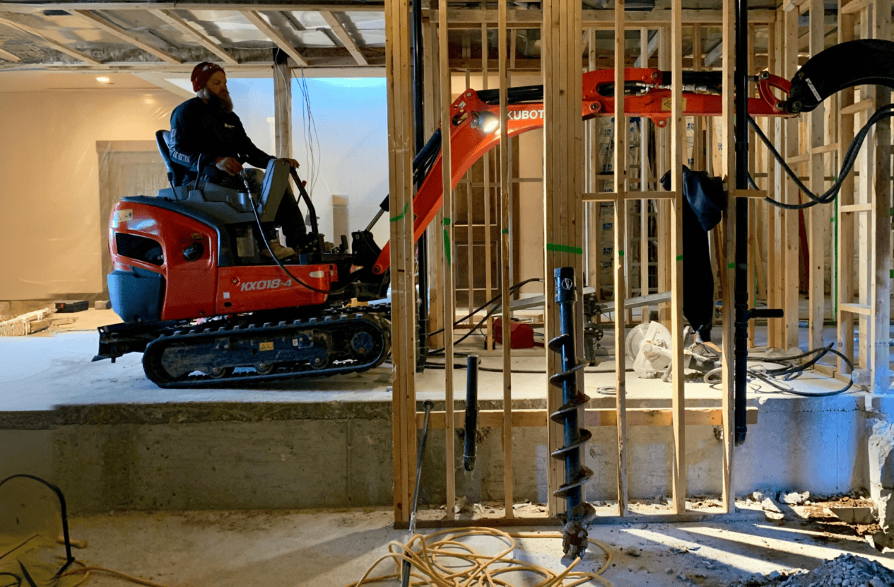 Avec les informations nécessaires, notre installateur certifié GoliathTech procédera à l'excavation autour de votre fondation. Une fois la semelle exposée et préparée, les pieux vissés seront installés conformément au dessin d'ingénierie et fixés sous la semelle de fondation. Notre installateur utilisera un vérin hydraulique pour s'assurer que la semelle est bien supportée.